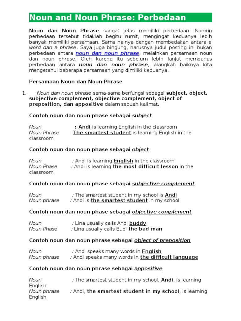 10 contoh kalimat noun phrase. No contoh kalimat noun phrase. Sama halnya dengan kata benda noun phrase juga bisa berfungsi sebagai subject object dan juga complement. The red pencil that i bought at the book store that is located on jalan pahlawan. Adjective phrase sama sama menerangkan noun seperti simple adjective hanya saja bentuknya lebih rumit. Dalam sebuah kalimat kata benda noun ini memiliki posisi sebagai subjek maupun objek dan dapat diterangkan. Edward seorang pembicara yang lucu 2.