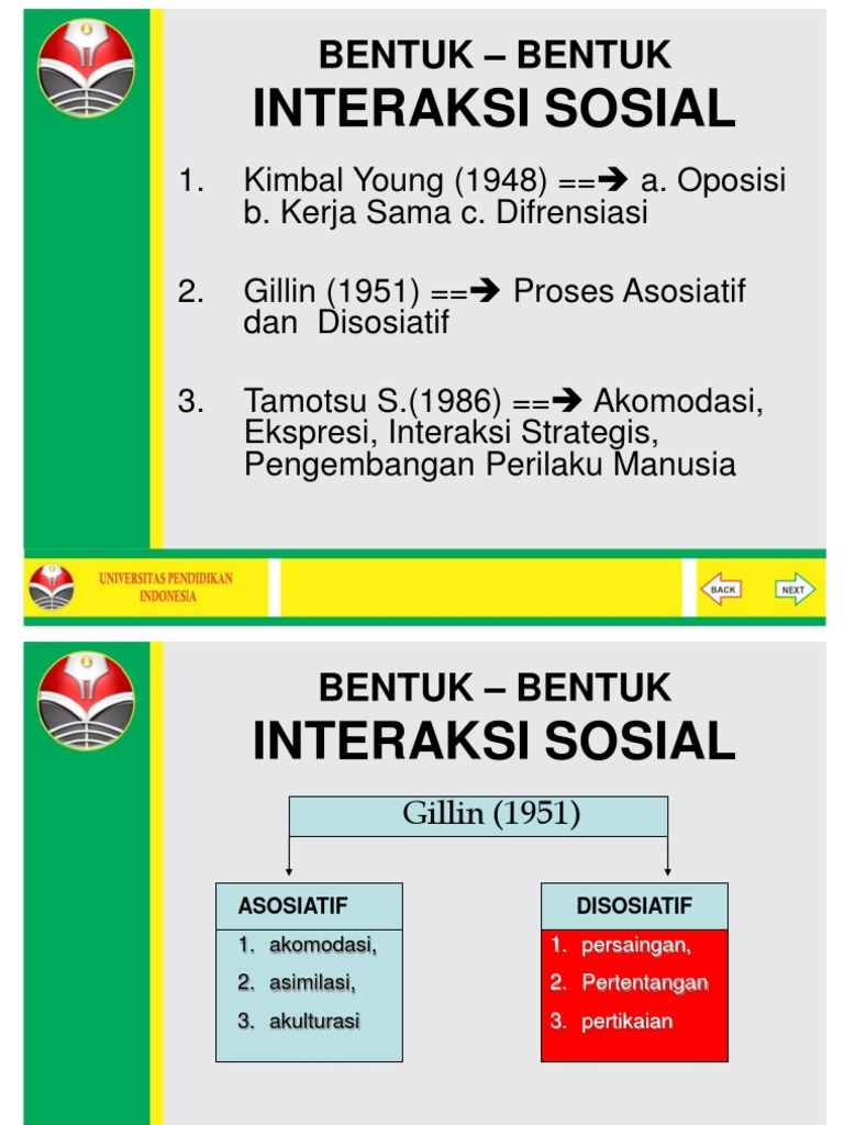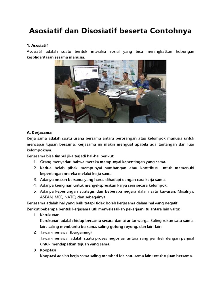 Bentuk bentuk interaksi sosial asosiatif dan disosiatif beserta contoh. Bentuk bentuk interaksi sosial asosiatif dan disosiatif pembahasan sebelumnya kita dapat simpulkan bahwa terdapat berbagai wujud dari interaksi sosial. Bila pada proses sosial asosiatif lebih menekankan bentuk kerja sama proses sosial disosiatif lebih ditekankan pada bentuk persaingan atau perlawanan. Terdapat tiga bentuk interaksi disasosiatif yaitu persaingan kontravensi dan pertentangan. Dalam praktek nya asosiatif sering di temukan di masyarakat dan pedesaan. Bentuk bentuk interaksi sosial interaksi sosial adalah hubungan antar dua individu atau kelompok yang saling mempengaruhi satu sama lainsecara umum jenis dan bentuk bentuk interaksi sosial dibedakan menjadi dua yakni asosiatif dan disosiatif. Proses ini sangat bergantung kepada kerjasama dan penyesuaian diri suatu individu dengan lingkungan nya sehingga tercipta proses sosial yang asosiatif.