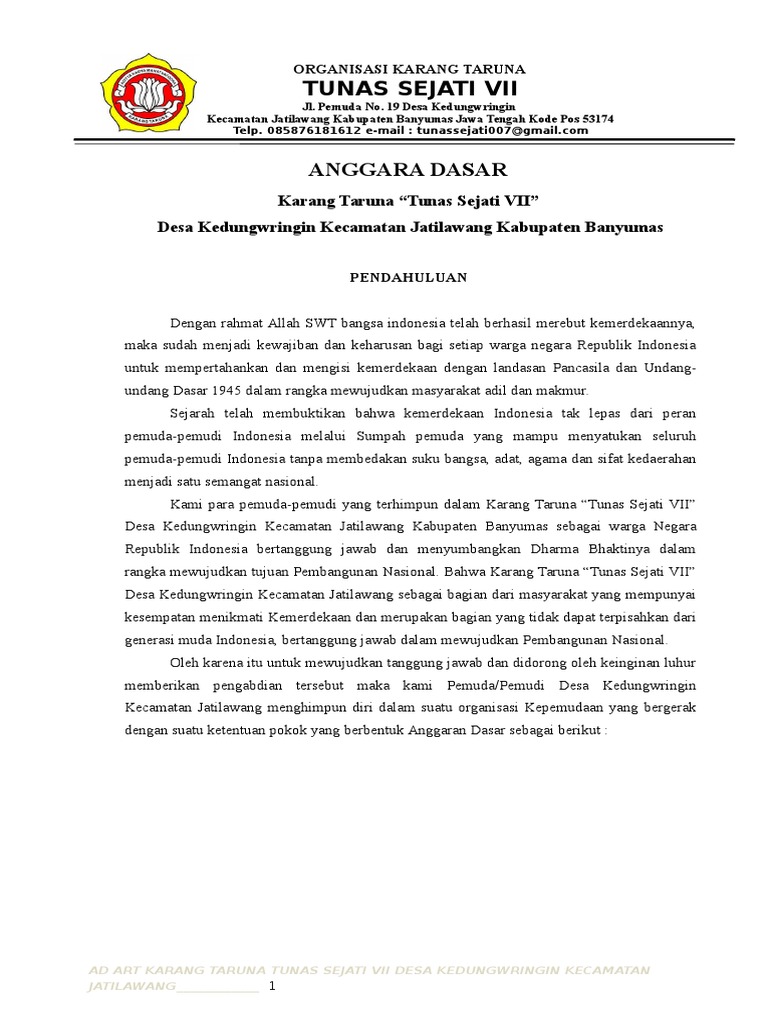 Contoh ad art organisasi pemuda. Pataka panji panji kartu tanda anggota kta pakaian seragam papan nama kop surat stempel dan kelengkapan lainnya yang diatur dalam anggaran rumah tangga. Mubeskar pemuda pakarti nomor 01 tahun 2013 tentang tata tertib musyawarah besar karan. Organisasi pemuda pancasila memiliki atribut yang merupakan identitas organisasi berupa. Karang taruna beranggotakan pemuda dan pemudi dalam adart nya diatur keanggotaannya mulai dari pemudai berusia mulai dari 11 45 tahun dan batasan sebagai pengurus adalah berusia mulai 17 35 tahun. Mentaati aturan kode etik dan disiplin sanggar 3. Segala puji hanya bagi allah kami memuji nya memohon pertolongan dan ampunan kepada nya kami berlindung kepada allah dari kejahatan diri diri kami dan dari kejelekan amal perbuatan kami.