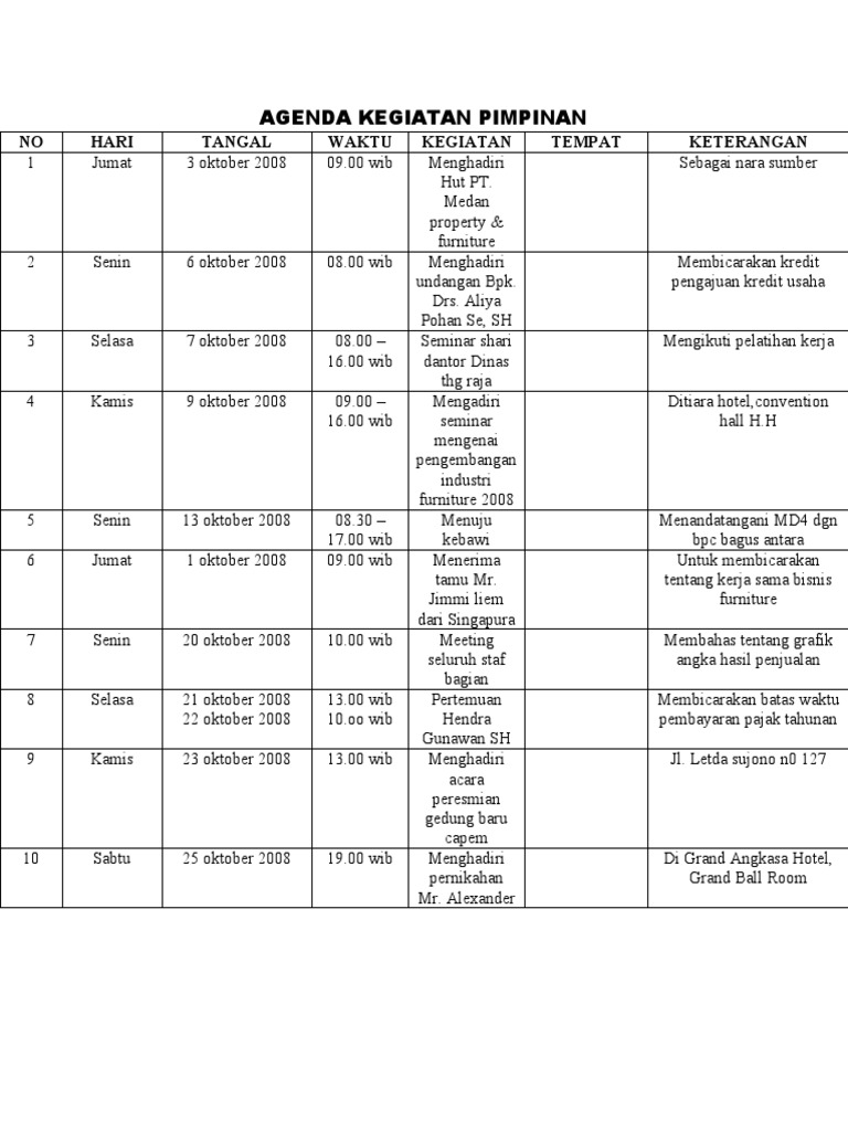 Contoh agenda rapat agenda rapat an bpkirawan juardy 05 sd9 mei 2008 no hari tanggal waktu kegiatanagenda. Setelah agenda mingguan kita buat selanjutnya adalah menentukan waktu pelaksanaan. Agenda kerja pimpinan disusun oleh sekretaris pimpinan dengan cermat sehingga tidak menghambat aktivitas pimpinan yang harus dilaksanakan sesuai manajemen waktu secara optimal. Bagian terbaiknya adalah canva memudahkan proses desain agenda harian menggunakan fitur tarik dan lepas yang intuitif tanpa perlu perangkat lunak desain yang rumit. The excel challenge 1233080 views. Memperhatikan kebersihan kerapihan lemari arsip dan meja kerja.