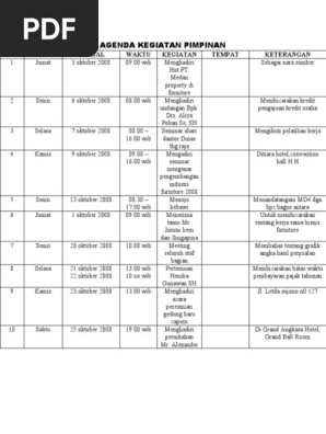Senin 1 oktober 2012. Senin 14 nov 2009. Mudah mudahan isi postingan artikel pendidikan artikel soal yang kami tulis ini dapat anda pahami. Hal ini karena jadwal kerja pimpinan adalah berupa susunan kegiatan perjalanan ke suatu tempat yang dilakukan oleh pimpinankaryawan pegawai yang berkaitan dengan tugas suatu lembagaperusahaan yang berkaitan dengan tugas pekerjaan kedinasan. Meskipun agenda perjalanan dinas merupakan bagian dari agenda kerja pimpinan. Contoh agenda perjalanan dinas pimpinan pt mitra bangun persada.