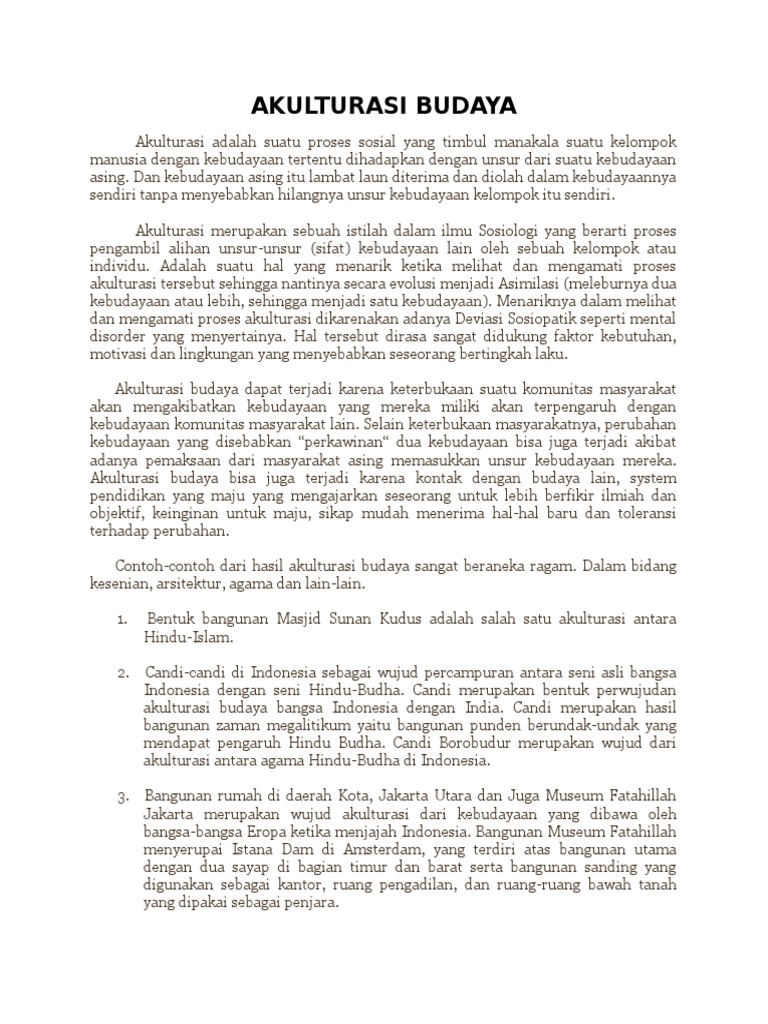 Bentuk candi tersebut adalah bentuk akulturasi antara unsur kebudayaan dari india dengan kebudayaan nusantara. 14 contoh akulturasi budaya di indonesia merupakan percampuran dua budaya hal ini yang membuat budaya di indonesia semakin beragam dalam banyak hal. Akulturasi kebudayaan islam adalah sebuah perpaduan budaya yang kemudian menghasilkan budaya baru tanpa menghilangkan unsur unsur asli dalam budaya contohnya sebuah proses percampuran 2 budaya atau lebih yang saling bertemu dan berlangsung dalam waktu yang lama sehingga dapat saling memengaruhi. Syarat masuk islam sangat mudah yakni cukup mengucapkan kalimat syahadat. Seni rupa dan seni ukir masuknya pengaruh india juga membawa perkembangan dalam bidang seni rupa seni pahat dan seni ukir. Akulturasi kebudayaan dari nusantara dan kebudayaan hindu budha terlihat dalam seni bangunan seperti contoh bangunan candi candi kerajaan hindu budha di indonesia.