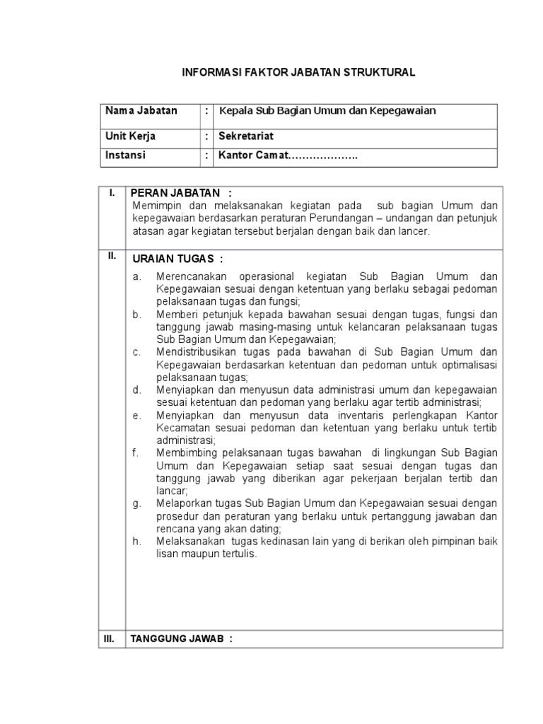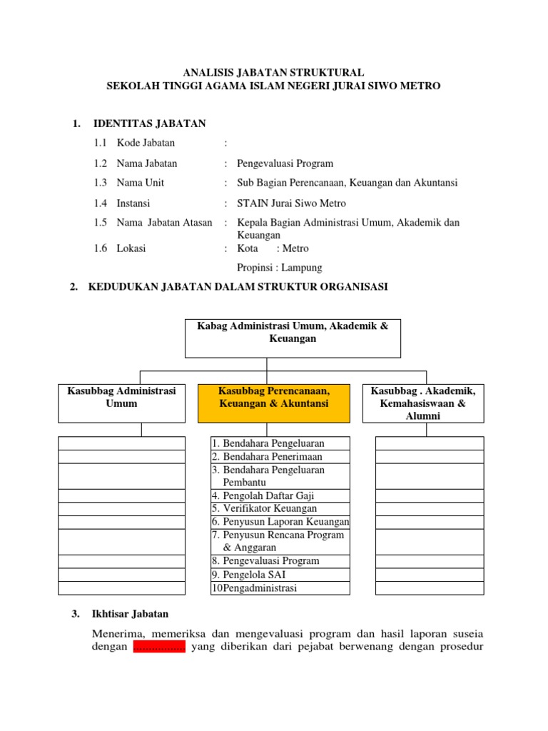0 0 upvotes mark this document as useful 0 0 downvotes mark this document as not useful embed. Unit kerjanya bagian analisa jabatan maka nama jabatannya kepala bagian analisa jabatan. Save save contoh analisis jabatan struktural for later. Pengertian analisis jabatan analisis jabatan pengertian makalah metode contoh pentingnnya analisis jabatan adalah kegiatan untuk menciptakan landasan atau pedoman bagi penerimaan dan penempatan karyawan. Contoh analisis jabatan struktural. Analisis jabatan memiliki 7 manfaat untuk memimpin suatu perusahaan atau organisasi salah satu manfaatnya adalah untuk memecahkan masalah tentang kepegawaian khususnya yang saling berhubungan dengan tugas yang harus dia lakukan di perusahaan tersebut.
