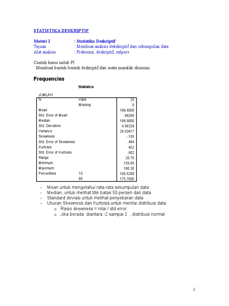 Statistika deskriptif hanya terbatas dalam penyajian data pada bentuk tabel diagram ataupun grafik serta besaran lainnya. Memusatkan perhatian dalam permasalahan yang terjadi dan bersifat aktual pada saat penelitian akan dilakukan. Metode ini hanya mendeskripsikan kondisi dari data yang sudah dimiliki dan menyajikannya dalam bentuk tabel diagram grafik dalam uraian uraian singkat dan juga terbatas. Karena itu metode pencarian deskriptif sangat relevan untuk digunakan. Statistik deskriptif pengertian materi jenis jenis contoh soal by azzahra rahmah posted on december 24 2019 rumuscoid setelah sebelumnya kita membahas tentang distribusi frekuensi kali ini kita akan membahas materi tentang statistik deskriptif lengkap kita akan jabarkan secara detail dan lengkap mulai dari pengertian jenis jenis dan contoh soal statistik dekriptif. Bila anda mendeskripsikan statistik deskriptif hanya dalam bentuk analisis sederhana tentu analisis ini akan terasa kurang bermanfaat.