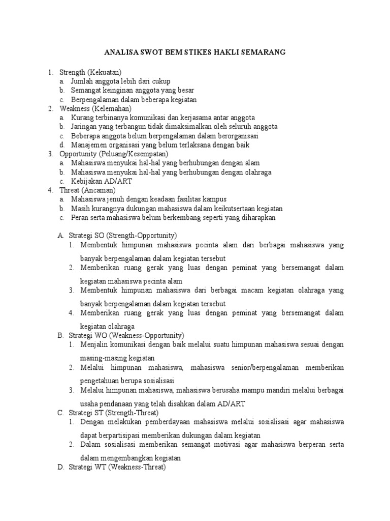 Contoh analisis swot organisasi mahasiswa. Berikut ini adalah 9 contoh analisis swot diri sendiri perusahaan usaha kecil yang dapat anda ketahui. Tapi jika kamu memang harus menganalisis badan seperti bnn mungkin kamu bisa berasumsi seolah2 kamu tahu fakta yang ada dalam organisasi tersebut. Smart generation mentorship region kalimantan timur 2012 4. Maka dari itu analisis swot bukanlah sebuah alat analisis yang ajaib yang mampu memberikan jalan keluar yang tepat bagi masalah. Karena strengh dan weakness yang tahu persis hanyalah orang yang ada dalam organisasi tersebut. Analisis swot utk perencanaan strategis analisis swot biasanya digunakan utk menganalisis suatu kasus yang kompleks atau menyusun rencana yang bersifat strategis menurut steiner perencanaan strategis merupakan penentuan sasaran pokok yang luas bagi organisasi dan berupa kebijakan strategis yang akan mengarah mengatur perolehan dan penggunaan serta mencapai sasaran tersebut.