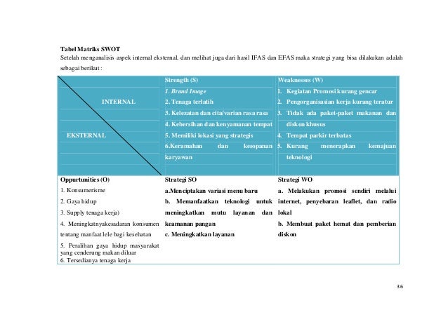 Berikut ini adalah contoh analisis swot usaha kecil jenis kuliner yaitu penjualan bakso. Strengths kekuatan brand sudah terkenal di kalangan masyarakat. Konsep lesehan agar mempermudah konsumen makan. Tempat yang strategis sehingga sangat mudah diakses. Berikut ini adalah contoh analisis swot untuk kuliner yang akan saya jalani d 1. Analisis swot adalah suatu analisis terhadap lingkungan internal dan eksternal wirausahaperusahaan dimana analisa internal lebih menitik beratkan pada kekuatan strenght dan kelemahan weakness sedangkan analisis eksternal untuk menggali dan mengidentifikasi semua gejala peluang opportunity yang ada dan yang akan datang serta ancaman threat dari adanyakemungkinan adanya pesaingcalon.
