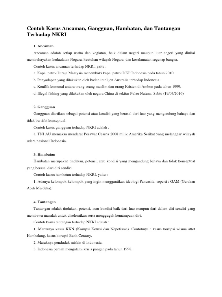 Sebagai warga negara indonesia yang terhormat kita dapat berpartisipasi dalam melindungi negara dengan mengakui dan mengatasi berbagai bentuk ancaman tantangan hambatan dan gangguan athg yang muncul sehubungan dengan republik indonesia seperti republik indonesia. Tugas ppkn contoh kasus ancaman tantangan hambatan dan gangguan terhadap nkri. Diajukan untuk memenuhi tugas pendidikan pancasila dan kewarganegraan. Gangguan ancaman hambatan tantangan. Nkri kata kunci. Oooo ini yang dimaksut dengan ancaman tantangan gangguan pada artikel ini yang membahas tentang pengertian ancaman gangguan tantangan saya ucapkan terima kasih karena setelah say abaca artikel ini saya menjadi tambah ilmu pengetahuan tentang pengertian ancaman dan gangguan serta tantangan saya sebagai pembac a mengucapkan terima kasih.