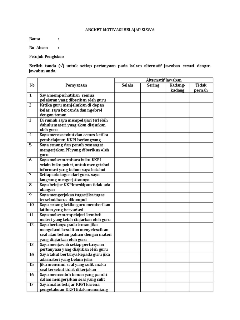 Contoh angket motivasi belajar siswa. 1 sangat tidak setuju 2 tidak setuju 3 ragu ragu 4 setuju dan 5 sangat setuju. Contoh angket penelitian hasil belajar siswa pengertian angket penggunaan pengambilan jenis skala empat merancang jenis prinsipkelebihan dan kelemahan contohnya oleh samhis setiawan diposting pada 20122019. Sumarsono april 8 2015 at 525 pm. Rekap skor yang diberikan siswa terhadap pernyataan pernyataan dalam angket minat siswa dan angket motivasi siswa dibuat dengan ketentuan sebagai berikut. Angket motivasi belajar angket motivasi belajar ini akan sangat bermanfaat dalam mengumpulkan dan memperoleh informasi dari motivasi setiap peserta didik. Judul skripsi jurusan ilmu pustaka.