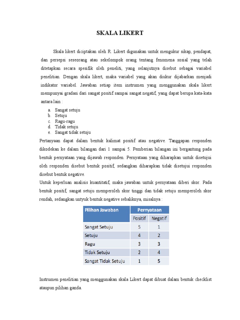 Skala ini merupakan suatu skala psikometrik yang biasa diaplikasikan dalam angket dan paling sering digunakan untuk riset yang berupa survei. Nilai jawaban skala 121 100 sb 91 120 b 61 90 cb 31 60 kb 0 30 skb kita ambil contoh perhitungan dengan menghitung satu jawaban pada skala likert kali ini. Pengertian skala thurstone skala guttman pada instrumen penelitian. Contoh instrumen penelitian psikologi. Pengertian atau definisi skala likert adalah skala yang digunakan untuk mengukur persepsi sikap atau pendapat seseorang atau kelompok mengenai sebuah peristiwa atau fenomena sosial berdasarkan definisi operasional yang telah ditetapkan oleh peneliti. Contoh angket atau kuesioner terbaru sebelum kita membahas jauh tentang kuesioner ini marilah kita bahas terlebih dahulu apa pengertian angket sehingga kita dapat menyamakan persepsi kemudian kita akan melanjutkan apa kegunaan fungsi dari angket kuesioner.