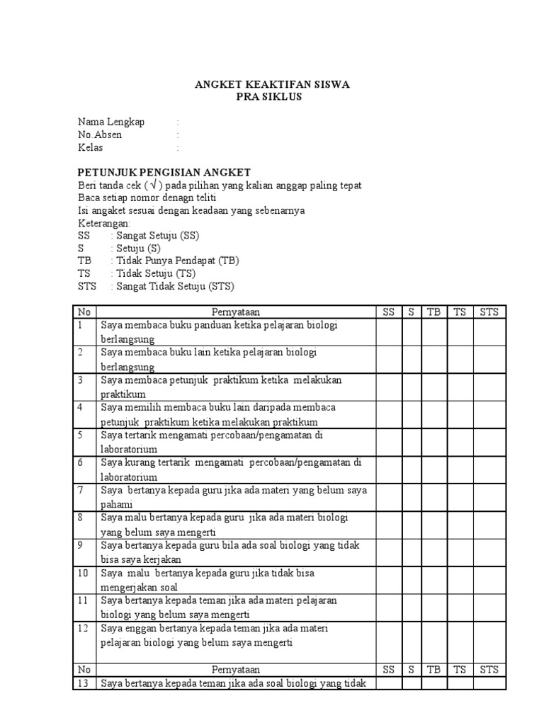 Contoh angket untuk siswa. Maka dari itu saya sharekan contoh angket. Angket ini bertujuan untuk mengetahui sejauh mana keberhasilan proses belajar mengajar di smk al irsyad kota tegal tahun ajaran 2014 2015 sehingga dari data yang di peroleh setelah di analisa oleh tim litbangakan di pergunakan untuk memperbaiki kinerja seluruh kegiatan pendidikan di tahun ajaran 2015 2016. Angket jenis ini harus di bagikan kapada responden siswa yang bersetatus sebagai murid dari guru yang akan diteliti. Penelitian ini bertujuan untuk menggambarkan sejarah pendidikan alumni siswa di universitas di mana alumni siswa pergi setelah menyelesaikan studi mereka dan apa yang mereka lakukan sekarang. Contoh angket atau kuesioner terbaru sebelum kita membahas jauh tentang kuesioner ini marilah kita bahas terlebih dahulu apa pengertian angket sehingga kita dapat menyamakan persepsi kemudian kita akan melanjutkan apa kegunaan fungsi dari angket kuesioner. Guru sebagai motivasi belajar siswa.