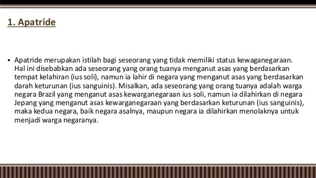 Contoh apatride dan bipatride. Seseorang akan mengalami kasus apatride jika dia atau orang tuanya telah melairkannya di negara yang memiliki faham ius sanguinis namun orang tuanya adalah orag yang berasal dari negara yag. Iif rohifah spd mak disusun oleh siti nurkholisoh 1502043 sekolah tinggi ilmu ekonomi stie miftahul huda jalan rancasari dalam no b 33 dsrancasari kecpamanukan kabsubang kode pos 41254 telpfax. Asas ius soli atau jus soli bahasa latin untuk hak untuk wilayah adalah asas pemberian kewarganegaraan berdasarkan tempat kelahiran terbatas. Apatride yaitu sebutan bagi orang yang tidak memiliki status kewarganegaraan. Asas ini lebih sesuai dengan kondisi global saat ini di mana status kebangsaan dan kewarga negaraan seseorang tidak ditentukan oleh dasar etnis ras atau agama. Misalnya agus dan ira adalah suami istri yang berstatus negara b yang berasal dari ius soli.