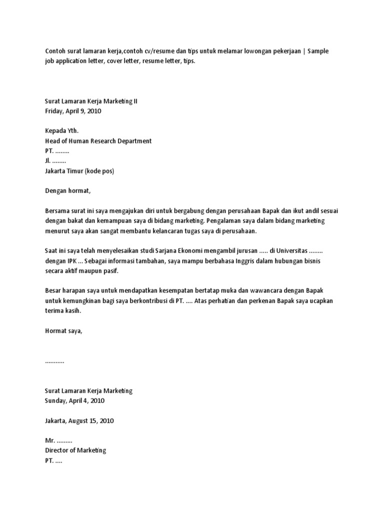 Bagi anda yang bingung tentang cara membuat surat lamaran kerja application letter maka anda bisa melihat referensi atau contoh. Dalam penulisannya perlu menggunakan cover letter yang menarik perhatian serta isi yang struktural. Cover letter seharusnya bisa mencerminkan kemampuanmu beserta pengalaman yang relevan dengan pekerjaan yang ingin kamu ambil. Memiliki kemampuan berbahasa inggris yang baik secara pasif dan terlebih aktif akan menambah nilai jual seseorang dalam dunia kerja. Lampung 24 april 2015. Bapak ibu hrd.
