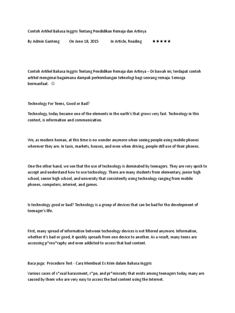 Contoh artikel bahasa inggris tentang teknologi. Seperti kata pepatah tuntutlah ilmu sampai ke negeri china. Contoh artikel tentang perkembangan teknologi informasi perkembangan teknologi menjadi hal yang sudah tidak asing lagi perkembangan teknologi informasi saat ini memang jauh lebih pesat dari tahun tahun sebelumnya transformasi dari teknologi masalalalu menjadi teknologi yang lebih cangggih mudah dan cepat artikel yang akan di bahas di bawah ini adalah tentang perkembangan teknologi infomasi. Dalam bahasa inggris kata ini banyak digunakan namun apa sih sebenarnya yang dimaksud dengan artikel itu sendiri. Contoh artikel bahasa inggris tentang teknologi beserta arti oleh ning setiawati diposting pada maret 16 2020 sahabat ibi pasti sudah tidak asing lagi bukan dengan kata artikel. Contoh artikel bahasa inggris tentang teknologi pertanian teknologi informasi khususnya di bidang pertanian saat ini mulai berkembang pesat di negara negara eropa di indonesia masih belum bisa meniru cara kerja mereka. Contoh artikel bahasa inggris tentang remaja beserta artinya terbaru hai sahabat sbi masih semangat belajar bukan.