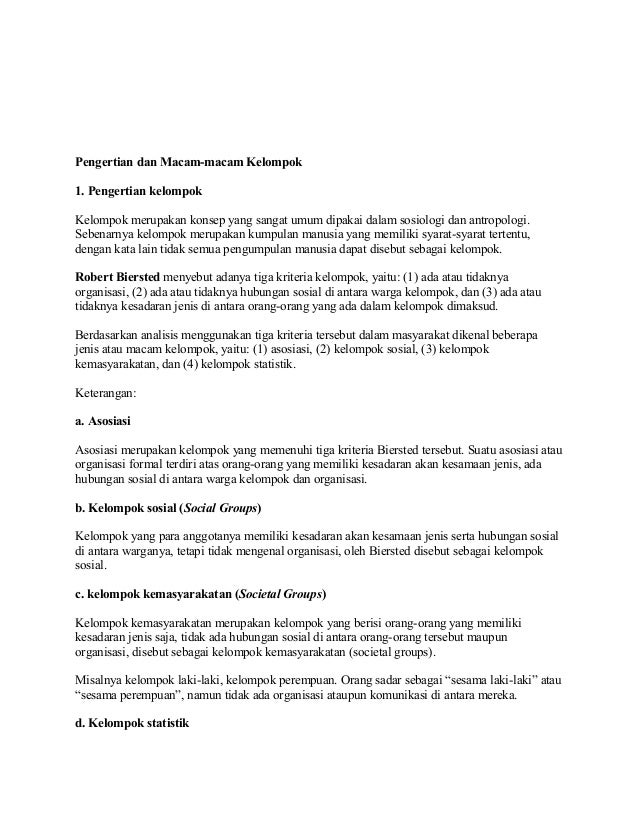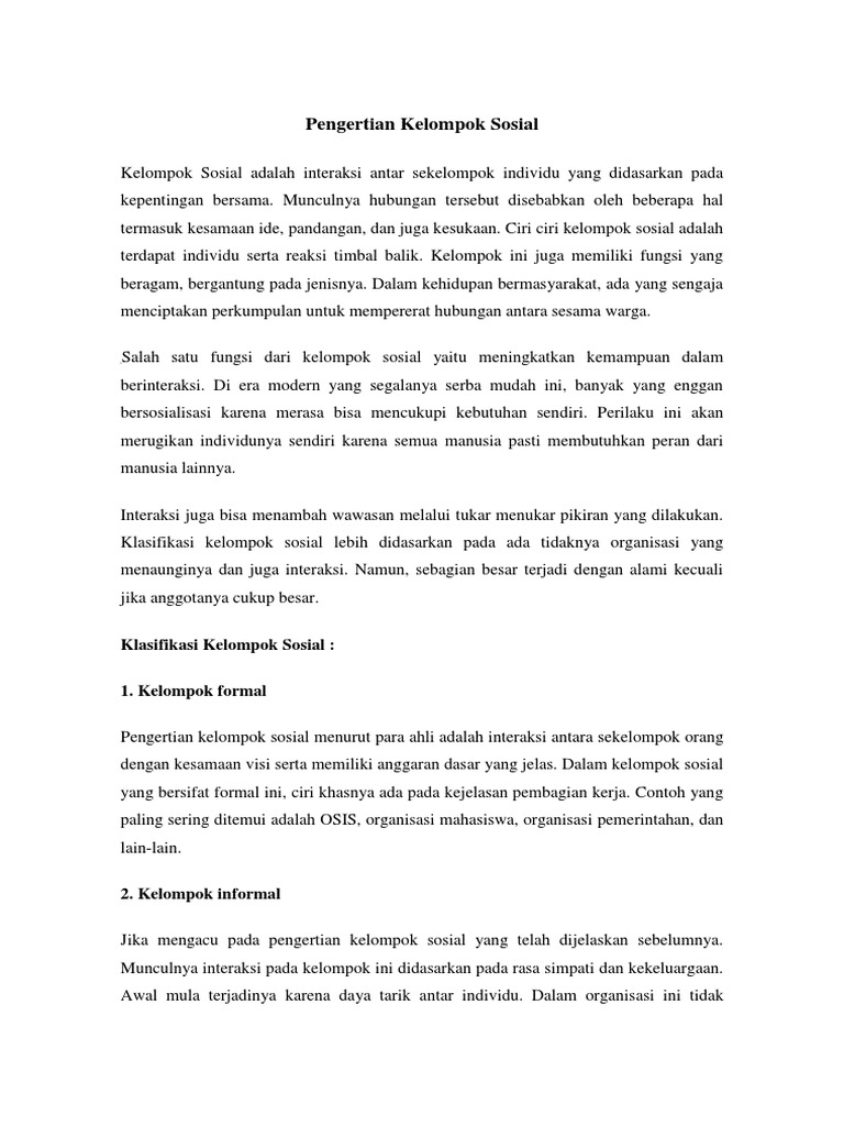Contoh artikel kelompok sosial. Kelompok sosial terbagi menjadi berbagai macam bentuk. Kelompok kelompok sosial dalam masyarakat multikultural di indonesia antara lain berdasarkan etnis agama maupun stratifikasi sosial. Contoh dari kelompok asosiasi adalah negara osis. Yang pertama adalah kelompok sosial primer dan sekunder. Kelompok sosial primer adalah yang sangat sederhana dengan anggota yang saling kenal satu sama lain dan memiliki kerjasama yang sangat erat. Pengertian kelompok sosial kelompok sosial adalah kumpulan manusia yang memiliki kesadaran bersama akan keanggotaan.