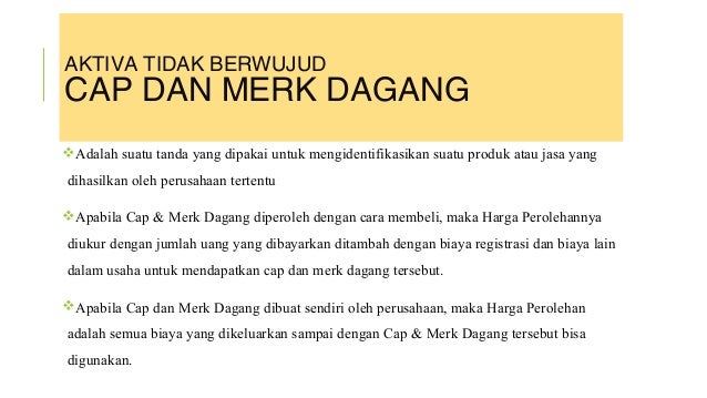 Aset tidak berwujud merupakan proporsi yang sedang meningkat dalam aset dari banyak jika tidak sebagian besar perusahaan. Jenis utama aset tidak berwujud adalah hak cipta hak eksplorasi dan eksploatasi paten merek dagang rahasia dagang dan goodwill. Perolehan aset tak berwujud dicatat dan diakui sebesar nilai faktur serta ditambah semua biaya yang menyertai untuk mendapatkan asethaknya sama seperti aset berwujud. Aktiva tetap berwujud yang memiliki umur terbatas limited life plant equipment. Contoh soal amortisasi aset tidak berwujud. Pt sedap sari mendapatkan daftar pelanggan dari surat kabar besar dengan harga rp6000000.
