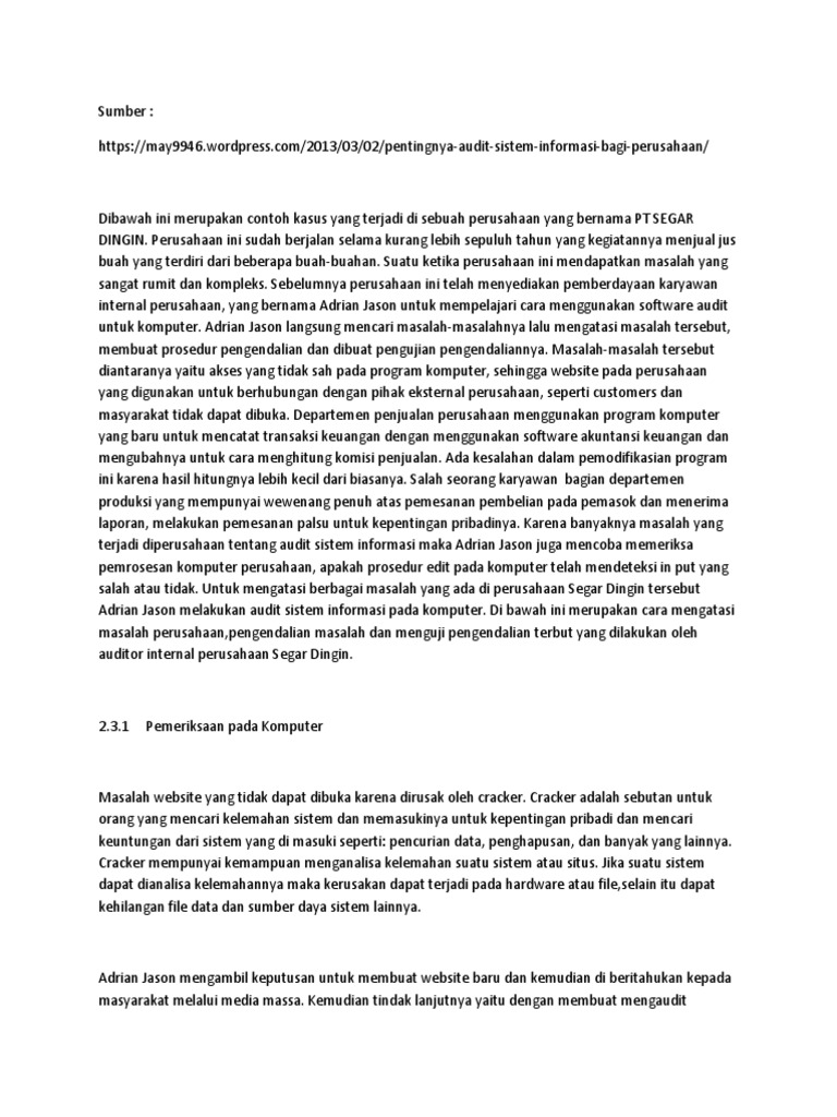 Kumpulan contoh contoh soal audit sistem informasi. Contoh kasus audit sistem informasi studi kasus. Sumatera post news sekitar 500 juta yen rp44 miliar deposito di enam bank di indonesia telah ditarik oleh kartu kartu atm palsu setelah informasi pribadi nasabah dibocorkan oleh sebuah perusahaan sejak januari 2007. Berikut ini adalah kumpulan contoh jurnal penelitian sistem informasi yang merupakan kumpulan file dari berbagi sumber jurnal tentang contoh contoh audit sistem informasi yang bisa bapakibu gunakan dan diunduh secara gratis dengan menekan tombol download biru dibawah ini. Artikel contoh audit sistem informasi. Audit sistem informasi adalah proses pengumpulan dan pengevaluasian bukti bukti untuk membuktikan dan menentukan apakah sistem aplikasi komputerisasi yang digunakan telah menetapkan dan menerapkan sistem pengendalian intern yang memadai apakah aset organisasi sudah dilindungi dengan baik dan tidak disalah gunakan apakah mampu menjaga integritas data kehandalan serta efektifitas dan.