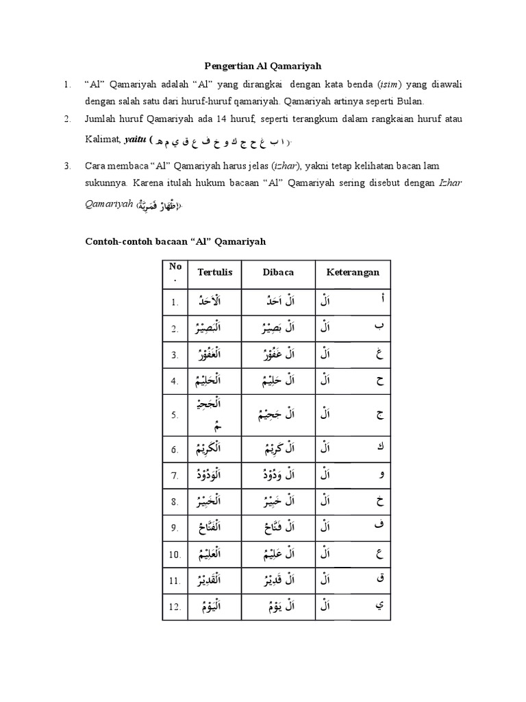 Dikatakan idgham syamsiyah karena suara alif lam di idghamkan ke dalam huruf syamsiyah yang ada dihadapannya sehingga suara alif lam menjadi lebur karena dimasukkan dengan huruf syamsiyah tersebut. Masing masing porsi hurufnya sama. Secara pengertian di dalam ilmu tajwid al qomariyah adalah hukum bacaan yang disematkan ketika huruf al qomariyah berada setelah alif lam. Di mana pada contoh contoh di bawah ini bacaan al tidak dibaca dengan jelas. الرحمن dibaca ar rohmaan huruf al tidak terbaca. Apabila alif lam tarif bertemu dengan huruf hijaiyah yang 29 hukum bacaannya terbagi dua bagian yaitu alif lam qamariah dan alif lam syamsiah.