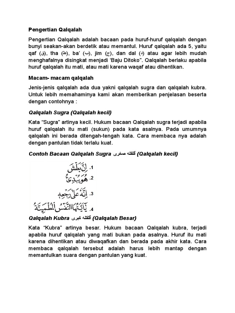 Untuk lebih memahaminya kami akan memberikan penjelasan beserta dengan contohnya. Berdasarkan skema di depan dapat disimpulkan bahwa terdapat perbedaan antara qalqalah sugra dengan qalqalah kubra. Hukum bacaan qalqalah sugra. Dalam keadaan ini qalqalah dilakukan apabila bacaan diwaqafkan tetapi tidak diqalqalahkan apabila bacaan diteruskan. Maaf sekedar berbagiqalqalah yang bertasydid itu memang ada hukumnya.