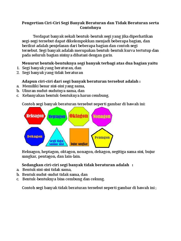 Persegi panjang belah ketupat jajaran genjang segitiga sama kaki segitiga siku siku trapesium dan lain lain. Segi banyak tidak beraturan. Bangun semacam ini sering disebut poligon. Segi banyak adalah bangun tertutup yang seluruh sisinya dibatasi oleh garis. Kd 48 mengidentifikasi segi banyak beraturan dan segi banyak tidak beraturan. Nah itulah tadi klarifikasi wacana ciri ciri segi banyak beraturan kali ini biar berkhasiat dan salam metif media edukatif.
