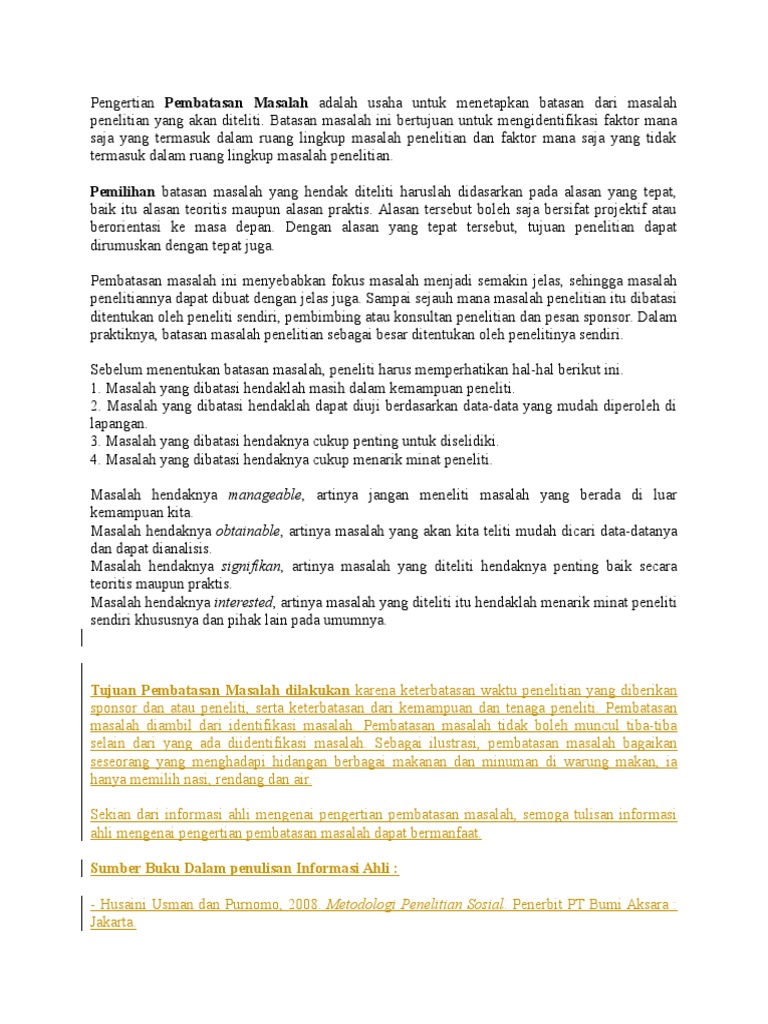 Nah untuk lebih jelasnya coba kalian simak ulasannya di bawah ini. Penulisan karya ilmiah dilakukan secara runtut dan sistematis. Dengan mengatakan bahwa preman yang anda teliti adalah preman yang tinggal di gerbong stasiun ampera maka anda sudah memberi batasan pada penelitian anda. Ide ide atau gagasan yang ada dalam benak kita tidak bisa begitu saja kita tuangkan menjadi suatu tulisan karya tulis ilmiah. Contoh batasan masalah dalam sebuah karya tulis seperti sebuah penelitian percobaan dan lainnya tentu dilampirkan sebuah batasan masalah yang membatasi permasalahan yang akan diselesaikan dalam karya tulis tersebut dalam artikel sebelumnya kita telah membahas mengenai contoh pendahuluan makalah. Contoh karya tulis ilmiah pengertian struktur tujuan.