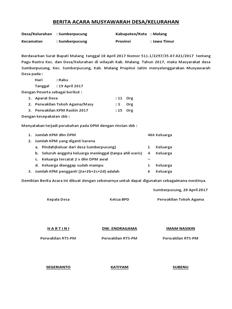 Berita acara bpd adalah salah salah alat buktidokumen yang harus disiapkan oleh pengurus badan permusyawaratan desa bpd untuk mendokumentasikan rangkaian acara atau rapatmusyawarah bpd. Tempat balai desa merubung. Contoh berita acara berita acara adalah sebuah naskah dinas atau surat yang di dalamnya memuat pernyataan pengesahan tentang suatu kegiatan rapat kehilangan kerusakan dan serah terima barang penyelesaian pekerjaan kejadian peristiwa perubahan status dll. Contoh notulen rapat musyawarah desa dimana biasanya akan digunakan ketika sudah menyusun pemerintahan atau perangkat desa dimana saja. Contoh berita acara musyawarah perencanaan pembangunan tingkat desa ini formatnya pdf silahkan klik contoh berita acara musrenbang dalam berita acara musrenbang juga terlampir daftar daftar rencana pembangunan untuk tahun yang akan datang misalnya musrenbang dilaksanakan tahun 2016 maka dalam musrenbang desa kecamatan dst itu membahas pembangunan yang akan dilaksanakan pada tahun 2017. Telah diselenggarakan musyawarah desa yang dihadiri oleh kepala desa unsur perangkat desa bpd wakil wakil dari kelompok masyarakat serta unsur lain yang terkait di desa sebagaimana tercantum dalam daftar hadir terlampir.