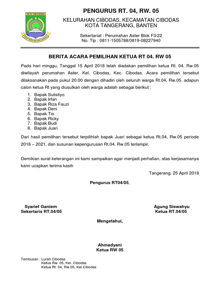 Contoh berita acara pemilihan rt. Tanda terima penyampaian berita acara dan sertifikat rekapitulasi hasil penghitungan perolehan suara pemilihan ketua rtrw 5. Forulir formulir kelengkapan pendaftara n dan pemilihan ketua rtrw serta surat mandate saksi. Pada hari in minggu tanggal dua puluh dua bulan april tahun dua ribu dua belas jam 2050 wib bertempat di gedung serba guna rw. Berita acara pemilihan ketua rt03 rw 03. Periode 2012 2015. Academiaedu is a platform for academics to share research papers.