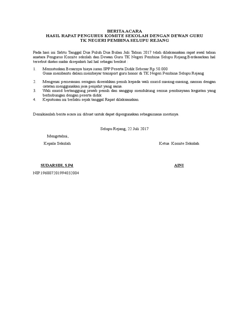 Beberapa instansi atau perusahaan menggunakan surat berita acara sebagai dokumen. Contoh berita acara berita acara adalah sebuah naskah dinas atau surat yang di dalamnya memuat pernyataan pengesahan tentang suatu kegiatan rapat kehilangan kerusakan dan serah terima barang penyelesaian pekerjaan kejadian peristiwa perubahan status dll. Penyertaan surat ini dalam sebuah kegiatan dimaksudkan untuk mengetahui runtutan kejadian yang berlangsung. Notulen tersebut digunakan sebagai lampiran dalam dokumen kurikulum selain itu dokumen kurikulum juga harus melampirkan sk pembentukan panitia. Lompat ke halaman. Sk penyusun rkas 2017.