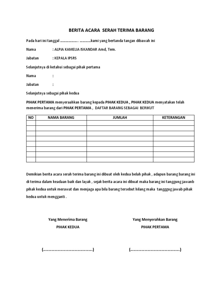Kali ini contoh surat tanda terima uang barang dan dokumen akan dijelaskan lebih rinci agar anda dapat membuat surat tanda terima sesuai dengan kebutuhan perusahaan atau kantor anda. Demikianlah berita acara serah terima barang ini di perbuat oleh kedua belah pihak adapun barang barang tersebut dalam keadaan baik dan cukup sejak penandatanganan berita acara ini maka barang tersebut menjadi tanggung jawab pihak kedua memlihara merawat dengan baik serta dipergunakan untuk keperluan tempat dimana barang itu dibutuhkan. Berita acara serah terima barang merupakan termasuk dokumen penyerahan barang yang amat krusial. Contoh berita acara serah terima uang kas tunai dari bendahara hasanusi. Demikianlah berita acara serah terima barang ini di perbuat oleh kedua belah pihak adapun barang barang tersebut dalam keadaan baik dan cukup sejak penandatanganan berita acara ini maka barang tersebut menjadi tanggung jawab pihak kedua memlihara merawat dengan baik serta dipergunakan untuk keperluan tempat dimana barang itu dibutuhkan. Contoh berita acara serah terima barang.