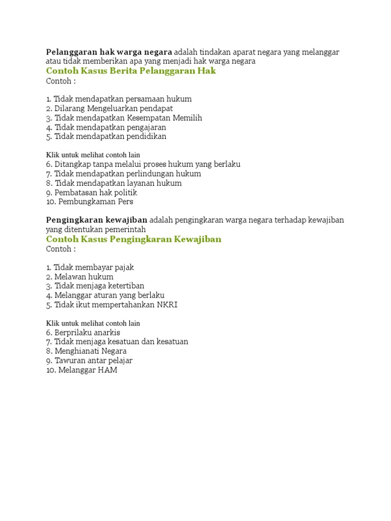 Pelanggaran hak warga negara merupakan akibat dari adanya pelalaian atau pengingkaran terhadap kewajiban baik yang dilakukan oleh pemerintah maupun oleh warga negara sendiri. Pelanggaran hak warga negara terjadi ketika warga negara tidak dapat menikmati atau memperoleh haknya sebagaimana mestinya yang ditetapkan oleh undang undang. Contoh pelanggaran hak dan pengingkaran kewajiban sebagai warga negara pelanggaran hak warga negara adalah tindakan aparat negara yang melanggar atau tidak memberikan apa yang menjadi hak warga negara contoh kasus berita pelanggaran hak contoh. Disamping contoh kasus integrasi sosial dan contoh kasus perlindungan konsumen berikut adalah beberapa contoh yang bisa anda simak dan pelajari. Contoh kasus pelanggaran hak warga negara. Selain itu pelanggaran tersebut juga terjadi karena adanya pelalaian ataupun pengingkaran.