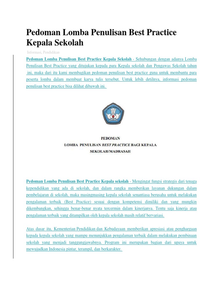 Inilah contoh laporan bestpractice kepala sekolah. Pedoman lomba penulisan best practice kepala sekolah 2019pdf sekian dulu info tentang contoh best praktice untuk kepala sekolah yang dilengkapi dengan juknis dan pedoman penulisan best praktice yang dapat admin sampaikan semoga dengan adanya uraian dan file diatas dapat bermanfaat dan dipergunakan sesuai dengan kebutuhan dan keadaan sekolah masing masing terima kasih.