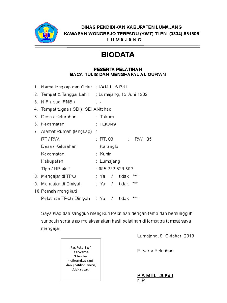 Contoh biodata peserta pelatihan. Contoh biodata diri terbaru dan lengkap biodata diri sering kali digunakan untuk informasi penting tentang data diri anda yang biasanya dibutuhkan dalam sebuah identitas atau dalam sebuah formulircontoh biodata biasanya diperlukan untuk mendaftar sekolah atau untuk melamar sebuah pekerjaan. Contoh biodata peserta pelatihan terbaru 2019 hai sob. Form biodata peserta diklat teknis aplikasi simaya gelombang ke 1 bpptik 2017. Sarana dan prasarana pelatihan. Contoh surat undangan peserta seminar atau pelatihan. Contoh biodata peserta 0257 unknown 1 comments.