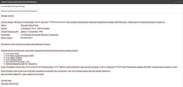 Dulu surat lamaran kerja memang selalu dikirimkan lewat pos atau diantar langsung ke perusahaankantor. Gunakan bahasa formal dan tertata. Contoh surat lamaran kerja via email yang benar seperti yang kita ketahui mengajukan surat lamaran kerja dapat dilakukan dengan beberapa cara misalnya. Kata kata body email singkat padat dan jelas untuk mengirim lamaran lewat email saya sarankan kalian menulis kata kata body email ini sesuai dengan format standar surat lamaran kaidah eyd lihat contoh gambar diatas kebanyakan para pelamar diluar sana tidak mengisi kata kata apapun di body email ini hanya lampiran saja hal itu merupakan kesalahan fatal karena body email justru ini yang. Format pdf merupakan format file yang profesional dan resmi. Dirinya mengaku sudah lelah harus menghabiskan kertas berlembar lembar karena sudah mengirimkan surat lamaran berkali kali dan selalu mendapat tolakan.