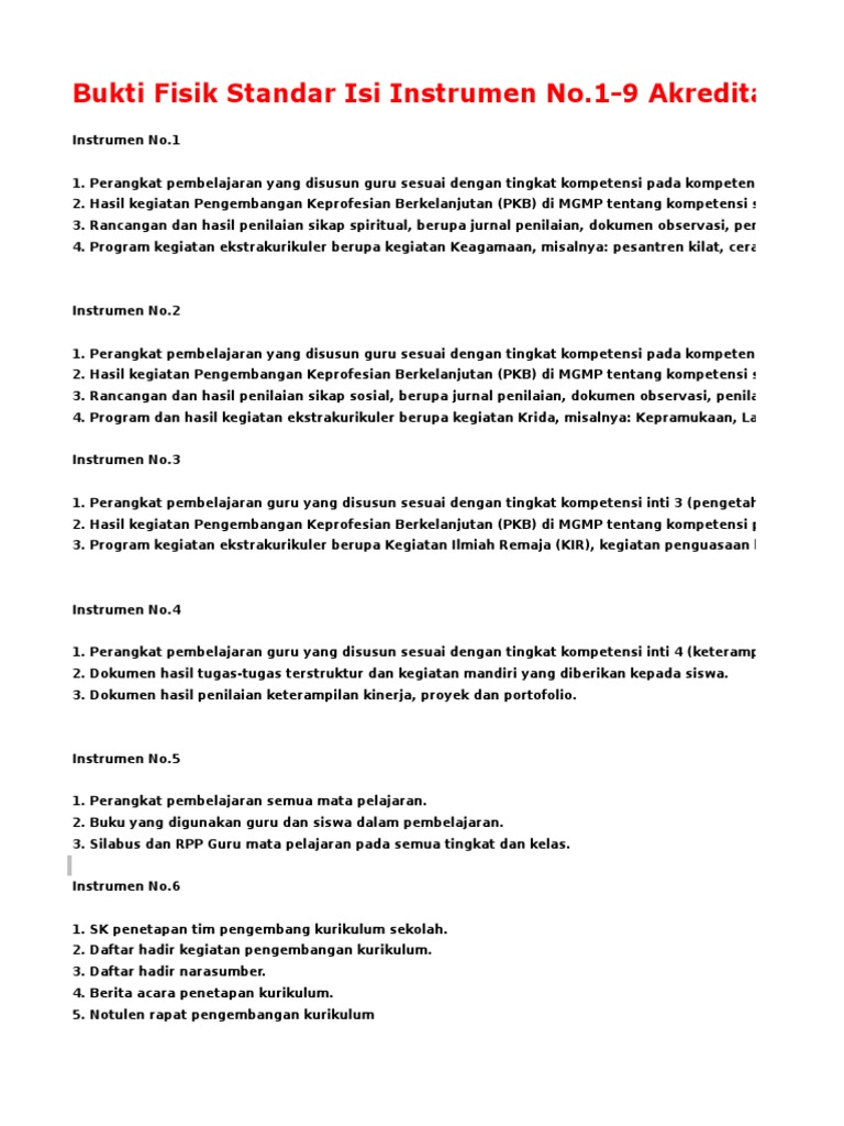 Contoh bukti fisik standar isi akreditasi sd 2017. Bukti fisik akreditasi sd 2018 standar isi instrumen 1 10 ini merupakan dokumen yang harus dipersiapkan dalam menghadapi akreditasi sd 20. Tidak hanya bukti fisik standar proses smp 2017 saja yang nantinya kami juga akan menyediakanbukti fisik standar ptk smp 2017bukti. Berdasarkan pada 8 standar nasional pendidikan maka disini saya sediakan lengkap untuk. Baca juga bukti fisik akreditasi 2018 sdmi standar isi. Bukti fisik yang dimaksud adalah administrasi perangkat dokumen akreditasi yang harus disediakan dalam kegiatan visitasi. Segera download perangkat akreditasi smp 2017.