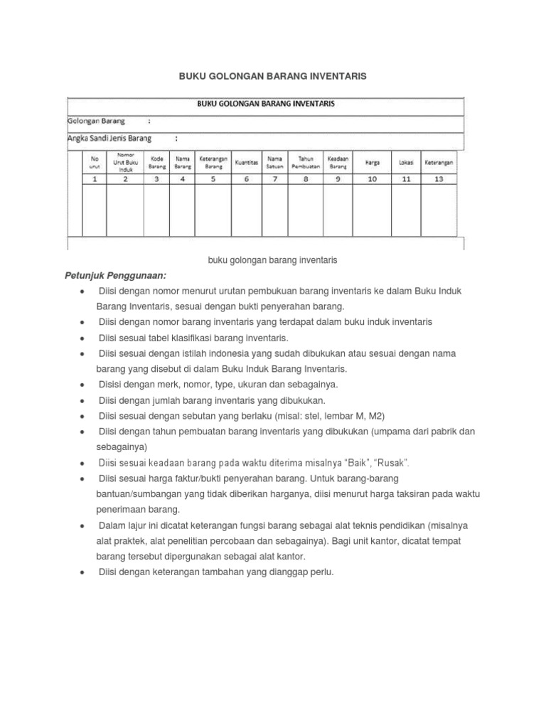 Buku induk barang inventaris ini akan disampaikan secara lengkap dengan pengertiannya cara membuat atau contohnya serta petunjuk pengisian buku induk barang inventaris secara terperinci. Buku inventaris barang sekolah yang akan bapakibu download ini mudah mudahan sesuai dengan harapan bapakibu dalam melengkapi administrasi disekolahnya. Sebagai bahan laporan tentang data inventaris barang yang dimiliki sekolah guru maupun ptk tata usaha akan membutuhkan format kartu. Inventaris adalah daftar lengkap barang barang yang ada di sebuah perusahaan atau instansi baik yang keluar maupun yang masuk baik yang berwujud ataupun tidak. Setiap koleksi barang atau perlengkapan yang menjadi milik lembaga paud harus didaftardiinventarisir untuk memudahkan lembaga mengetahui kondisi barang saat ini. Inventaris atau inventarisasi barang adalah semua kegiatan dan usaha untuk memperoleh data yang diperlukan tentang ketersediaan barang barang yang dimiliki dan diurus baik yang diadakan melalui pembelian menggunakan anggaran belanja maupun sumbangan atau hibah untuk diadministrasikan sebagaimana mestinya menurut ketentuan dan cara yang telah ditetapkan di masing masing instansi.