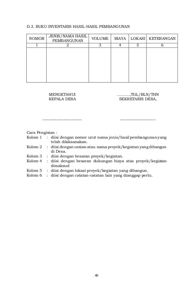 Setiap koleksi barang atau perlengkapan yang menjadi milik lembaga paud harus didaftardiinventarisir untuk memudahkan lembaga mengetahui kondisi barang saat ini. Nah sambil menunggu peraturan bupati walikota yang mengatur administrasi pemerintahan desa ada baiknya kita simak lampiran permendagri 472016 yang berisi contoh format dan cara pengisian buku administrasi desa. 1 sementara itu istilah inventaris desa tidak ditemukan dalam uu desa maupun permendagri 12016. Contoh peraturan desa nomor 1 tahun 2019. Definisi aset desa dan inventaris desa. Jumlah aset desa cukup banyak akan susah terawasi tanpa manajemen pencatatan yang baik.
