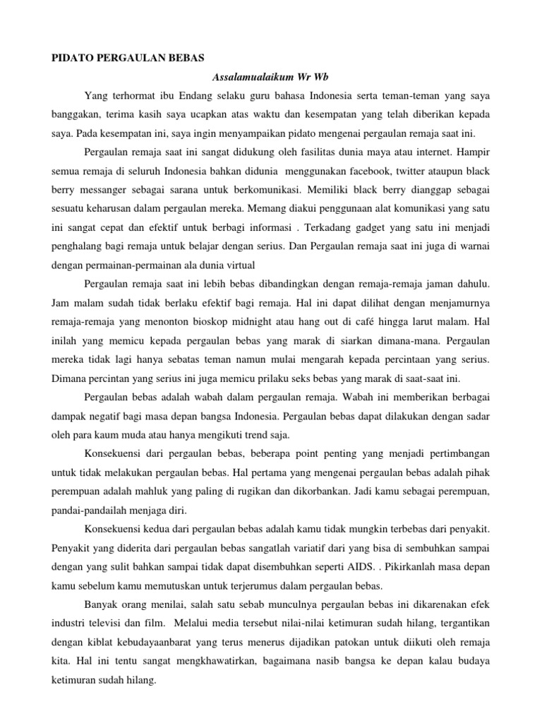 Contoh pidato singkat tentang pergaulan bebas kami akan sampaikan disini untuk bisa anda lakukan supaya teman teman dan sodara kita tahu dampak pergaulan bebas itu sangat tidak baik dan merusak diri sendiri untuk kesempatan ini admin blog contoh surat dan proposal akan memberikan disini untuk contoh pidato pergaulan bebas yang selama ini meresahkan masyarakat di indonesia. Silahkan simak sendiri contoh pidato singkat tentang pergaulan bebas berikut ini. Mulai dari contoh ceramah pendidikan contoh ceramah singkat sabar contoh ceramah tentang ibu contoh ceramah pergaulan bebas contoh ceramah menuntut ilmu contoh ceramah singkat tentang narkoba contoh ceramah kebersihan contoh ceramah kesehatan contoh ceramah media sosial contoh ceramah contoh ceramah tentang aurat contoh ceramah tentang. K e n t u t. Tidak lagi mengenal mana yang benar dan mana yang salah. Karena itu pergaulan bebas cenderung mengarah pada hal hal yang negative seperti seks bebas pemaiakan narkoba dan lain lain.