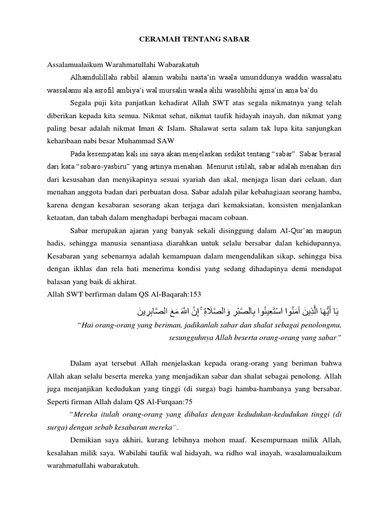 Contoh ceramah singkat tentang sabar. Sifat sabar itu menempati kedudukan sebagai kepala dari bagian jasad tidak jasad yang tanpa kelapa dan tidak ada keimanan bagi orang yang tidak bersabar. Untuk ceramah singkat sendiri banyak sekali ragamnya berikut akan dipaparkan beberapa mengenai contoh ceramah singkat mulai dari ceramah singkat tentang sabar tentang pendidikan menuntut ilmu kebersihan ikhlas shalat tentang ibu tentang cinta dan masih banyak lagi yang lainnya. Alhamdulillahirabbilalamin marilah kita ucapkan rasa syukur kepada allah swt karena telah memberi kita kesempatan untuk berkumpul di masjid besar ini untuk saling bersilaturahim. Sabar di bawah keputusan allah swt. Boleh copy paste tapi jangan lupa cantumkan sumber. Untuk ceramah singkat sendiri banyak sekali ragamnya berikut akan kami paparkan mengenai contoh ceramah singkat mulai dari ceramah singkat tentang sabar menuntut ilmu mengenai sholat serta berbakti kepada ibu.