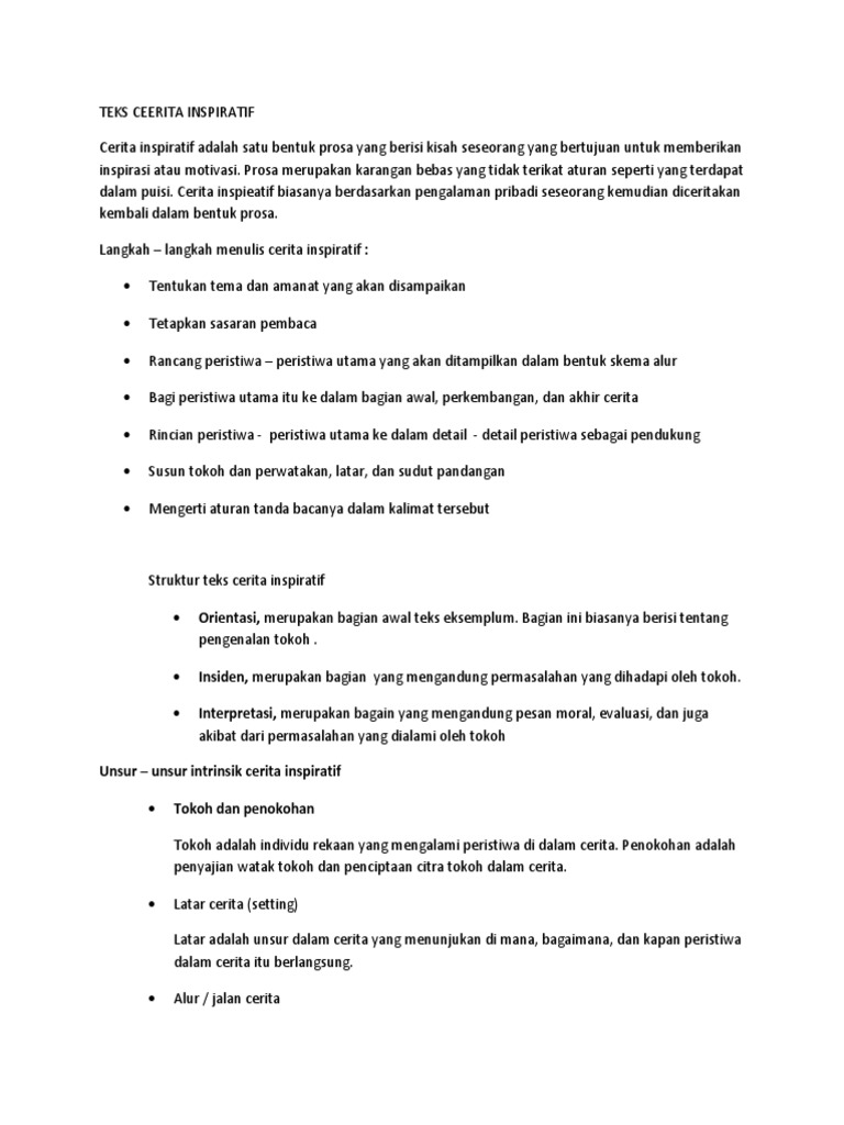 Adapun struktur teks cerita inspiratif adalah sebagai berikut. Contoh teks inspirasi singkat beserta strukturnya adalah cerita yang memberikan kesan agar orang lain dapat peduli untuk berbuat sesuatu. Semakin tanah ditimbun semakin tinggi tanah tersebut naik. Setelah banyak mengibaskan masalah dan melangkah belajar dari kisah di atas suatu saat setelah terlepas dari masalah anda akan mampu merumput di padang rumput hijau. Contoh cerita inspiratif singkat ini mengajarkan banyak hal seperti mengatur prioritas toleransi sampai menghargai jasa orang tua cocok untuk menjadi renungan hidup. Pada kondisi tertentu cerita inspiratif dapat membuat anda berjanji menjadi pribadi yang lebih baik lagi.