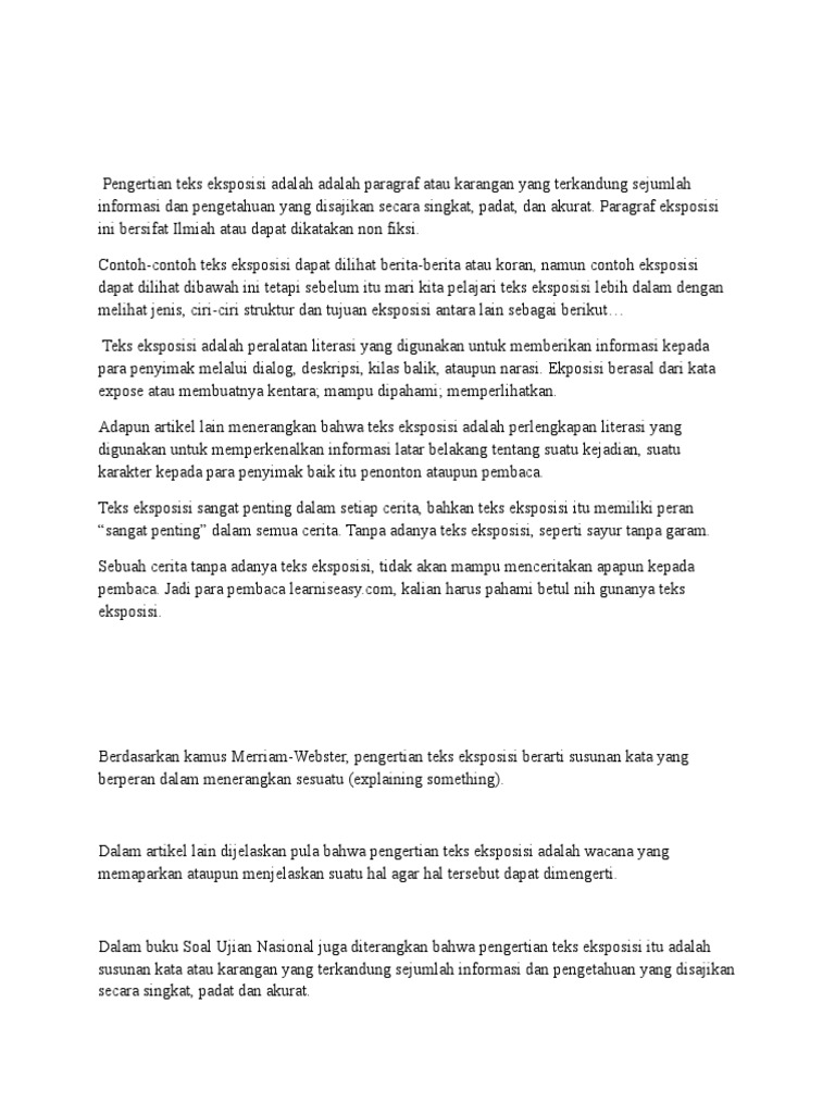 Uraian tersebut berbentuk tulisan yang singkat padat dan jelas agar pembaca akan lebih mudah memahami maksud dari. Contoh teks eksposisi teks eksposisi merupakan suatu tulisan yang berisi fakta atau informasi berbentuk pengembangan paragraf yang berupaya untuk menerangkan suatu keadaan tertentu sehingga orang yang membacanya mendapatkan pengetahuan dari apa yang diuraikan oleh penulis. Sehingga apa bila membaca teks tersebut maka seseorang mampu memperoleh sebuah informasi berharga. Kemacetan dan masa depan kota. Teks eksposisi merupakan sebuah pengembangan paragraf pada suatu penulisan yang dimana berisikan dengan tujuan dalam menjelaskan sebuah pengertian dengan gaya penulisan yang singkat padat serta akurat. Paragraf eksposisi adalah sebuah paragraf yang mengadung penjelasan explanation informasi information atau juga pengetahuan yang berkaitan pada topik yang.