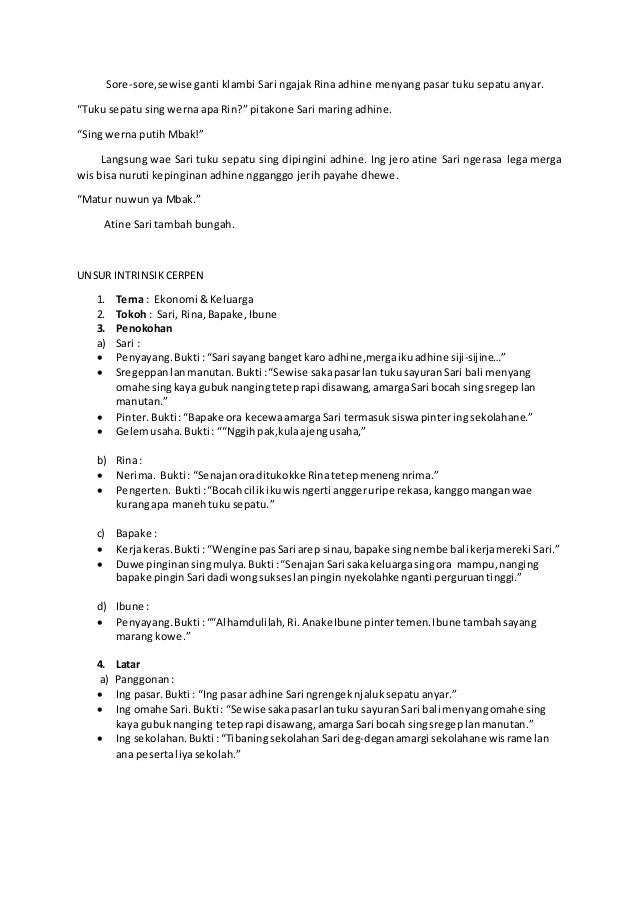 Buat yang lagi dapet tugas nyari cerkak. Impian kaliyan ketaman asmara. Bukti tokoh aku duwe watak sabar lan pangerten ana ing penggalan cerkak ing ngisor iki. Contoh cerkak crito cekak lan unsur intrinsik. Unsur instrinsik unsur intrinsik cerkak adalah suatu unsur yang dapat membangun karya sastra tersebutberikut unsur instrinsik yang mencakum dalam cerkak bahasa jawa. Biasanya dalam cerkak bahasa jawa akan memberikan sebuah pengaruh baik untuk kepada pembacanya karena didalamnya telah disematkan untuk memberi pengaruh baik.