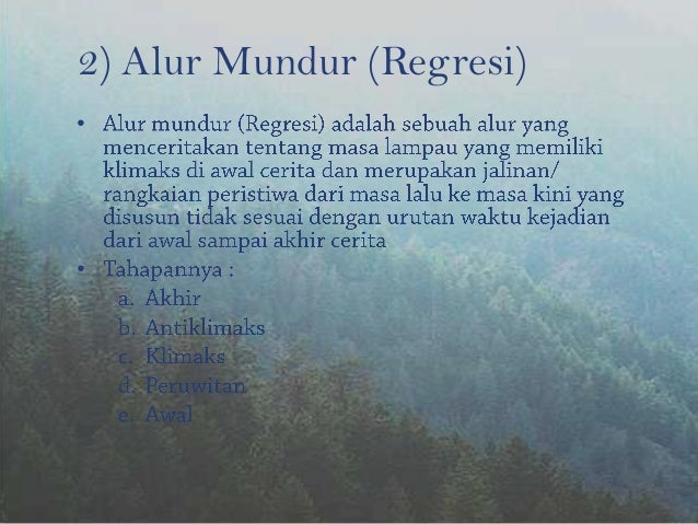 Cerita bergerak mundur alias flashback. Alur mundur regresi adalah sebuah alur yang menceritakan tentang masa lampau yang memiliki klimaks di awal cerita dan merupakan jalinan rangkaian peristiwa dari masa lalu ke masa kini yang disusun tidak sesuai dengan urutan waktu kejadian dari awal sampai akhir cerita. Biasanya bercerita tentang latar belakang sebuah kejadian. Pengertianya alur seperti ini. Ada beberapa jenis alur yang sering digunakan penulisan cerita fiksi yaitu 1 alur berdasarkan urutan waktu 2 alur kronologis alur majualur progresif 3 alur tidak kronologisalur mundur alur regresifalur flash back 4 alur campuran 5 alur berdasarkan jumlah 6 alur tunggal 7 alur ganda 8 lur berdasarkan kepadatan kualitatif 9 alur erat 10 alur longgar dan 11 alur menanjak. Sih penulis yang memakai alur ini haruslah pintar pintar dalam menyusun ceritanya agar tidak membuat pembacanya menjadi kebingungan.