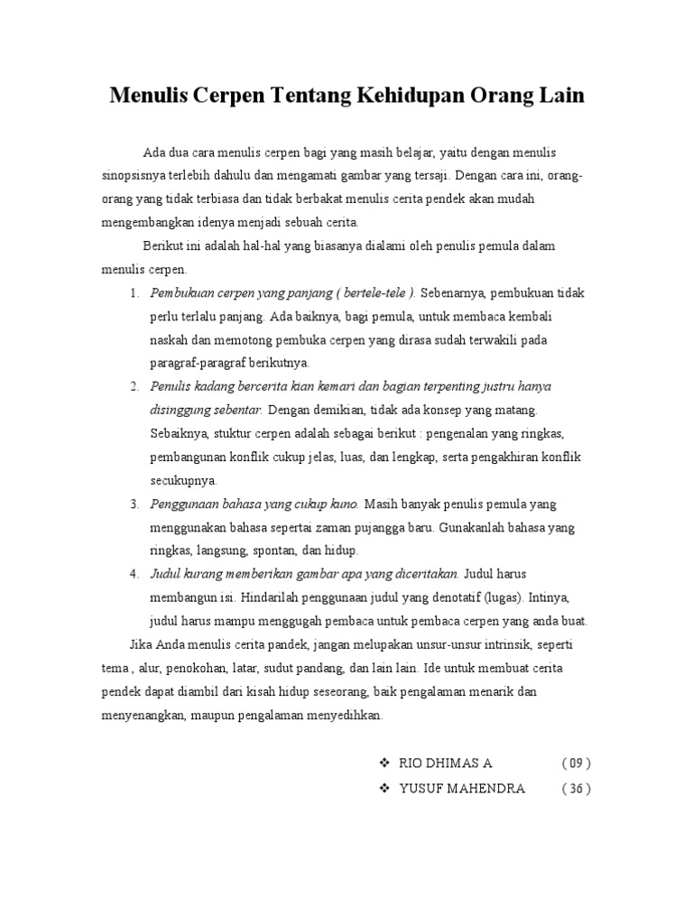 Contoh cerpen pengalaman orang lain. Karena saat di sekolah merekalah yang membimbing menjaga menegur kita selama kita. Daftar isicontoh cerpen singkat pendek1. Contoh cerpen dalam penggunaan cerpen singkat termasuk dengan cerita pendek merupakan suatu wujud prosa naratif fiktif. Cerpen merupakan salah satu bentuk tulisan di dalam bahasa indonesia yang berisikan berbagai kisah di dalamnya. Cahaya matahari yang menembus celah celah tirai kamarnya membuatnya terbangun dari mimpinya. Menulis cerpen berdasarkan kehidupan orang lain pelaku peristiwa.