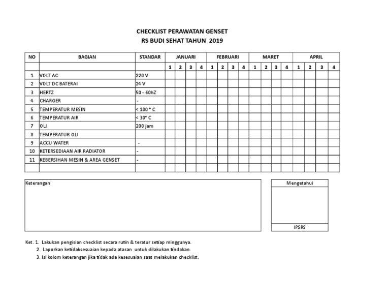 Contoh checklist perawatan genset. Adapun dari contoh checklist secara umum di buat dapat anda lihat di bawah ini. Contoh lembar checklist amdal gedung. 1 oktober 2011 iso 9001. Contoh checklist perawatan genset pekerja wajib perhatikan panduan keselamatan merawat generator diesel ini soal pemadaman listrik oleh pln seringkali berlangsung karena gempa banjir badai sampai timbulnya masalah pada perlengkapan utama pln. No record found jakarta head office. Checklist perawatan genset tahun 2016.