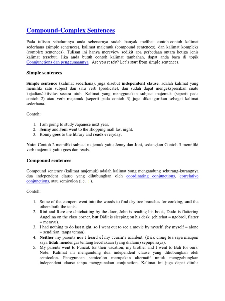 Contoh compound complex sentence. Compound complex sentence adalah sentence type tipe kalimat yang merupakan kombinasi antara compound sentence dan complex sentencetipe kalimat ini memiliki 3 atau lebih klausa di dalamnya dimana minimal ada 2 independent clause dan 1 dependent clause. Contoh kalimat complex sentence. Secara umum rumus dari jenis kalimat ini dapat dilihat dibawah ini namun rumus ini dapat berubah polanya bisa disesuaikan dengan jenis klausa yang digunakan. Penggunaan konjungsi dalam compound complex sentence. Belajar bahasa inggris grammar kalimat simple compound dan complex sentence adalah 3 macam kalimat bahasa inggris yang harus dipelajari terutama bagi yang ingin lebih memperdalam dan mengerti contoh discussion text argumentative dan jenis teks lainnyapengertian sekaligus contoh kalimat simple compund dan complex sentence menduduki porsi terbesar dalam mendapat perhatian ketika ingin. Contoh kalimat complex sentence dependent clause independent clause dan complex sentence.
