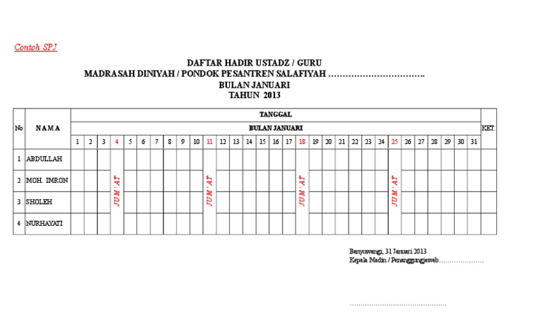 Contoh daftar hadir guru. Absensi daftar hadir guru format microsoft excel berikut ini adalah file absensi daftar hadir guru format microsoft excel dan absensi daftar hadir guru format microsoft excel ini termasuk ke dalam dokumen kategori aplikasi download guru microsoft excel dishare pada hari selasa 29 maret 2016 dan file ini mudah mudahan bermanfaat sebagai contoh atau referensi yang mungkin sedang anda perlukan. Download contoh daftar hadir guru piket excel. Pada artikel sebelumnya sudah pernah admin berikan contoh format absensi siswa pada artikel kali ini belajar office akan berbagi contoh format absensi untuk guru disekolahsemoga bermanfaat bagi sobat sobat guru yang sedang membutuhkan dan mencari contoh format ini silahkan download linknya dibawah ini. Berikut ini adalah download rpp silabus prota prosem kkm skkd ktsp 2006 sd kelas 5 yang merupakan kumpulan file dari berbagi sumber documentktsp 2006ktsp sdrpp silabus tentang contoh daftar hadir guru piket excel yang bisa bapakibu gunakan dan diunduh secara gratis dengan menekan tombol download biru dibawah ini. Buku absensi harian adalah daftar hadir yang akan mencatat tingkat kehadiran siswa setiap harinya. Daftar hadir guru piket di sekolah sangat diperlukan.