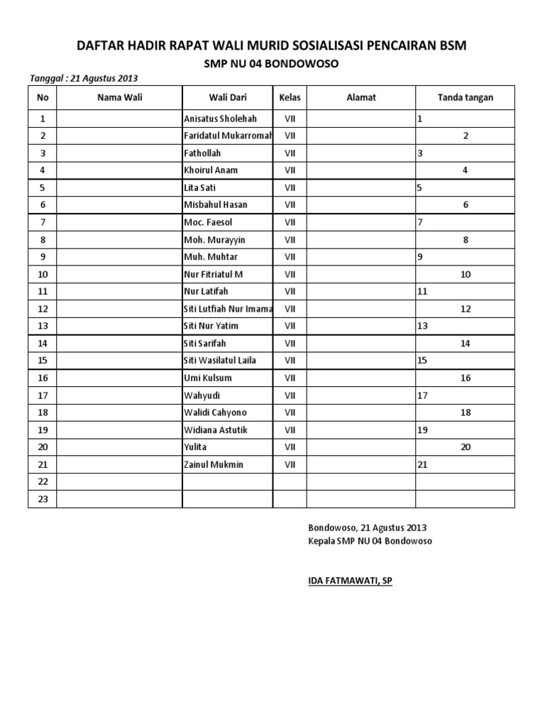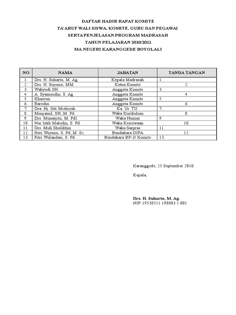 Contoh daftar hadir rapat. Jadi form daftar hadir nya simple saja. Sebagai bukti fisik dalam dokumentasi akreditasi sekolah tahun pelajaran 20192020 diantaranya adalah tentang visi misi dan tujuan sekolah. Contoh daftar hadir kegiatan. Sesuai dengan contoh beberapa hal yang perlu anda perhatikan ketika membuat berita acara kegiatanrapat antara lain yaitu kop. Attribution non commercial by nc format tersedia. Bagian paling atas dari berita acara ini merupakan hal wajib yang tidak boleh ketinggalan dalam sebuah berita acara.