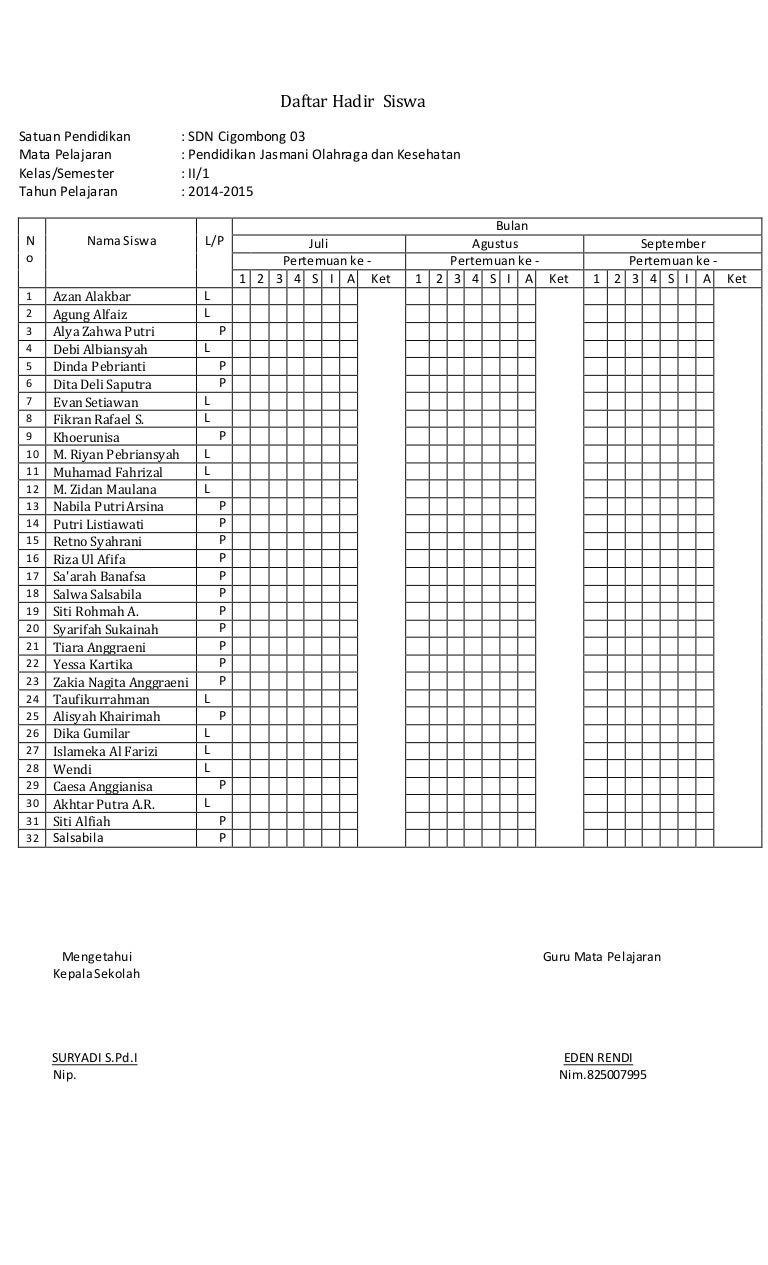 Daftar hadir guru pembimbing dan siswa ekstrakurikuler sepak bola mi al huda banyuarang tapel 2013 2014. Melihat daftar hadir siswa 1. Download contoh daftar hadir siswa ktsp semester 1 dan 2 klik disini download contoh daftar hadir siswa kurikulum 2013 semester 1 dan 2 klik disini download contoh daftar nilai siswa ktsp semester 1 dan 2 klik disini download contoh daftar nilai siswa kurikulum 2013 semester 1 dan 2 klik disini. Pada saat memasuki tahun ajaran baru atau memasuki tahun pergantian semester banyak perangkat sekolah yang harus di buat atau di rubah dan di perbaiki salah satunya adalah daftar hadir siswa di kelas. Bagi bapak dan ibu guru serta teman teman pendidik yang saat ini belum memiliki contoh format daftar hadir siswa yang di gunakan untuk mengabsen siswa dalam setiap harinya pada pembelajaran kurikulum 2013 maka pada kesempatan kali ini saya akan membagikan contoh format daftar hadir siswa di kelas versi kurikulum 2013. Pada postingan sebelumnya saya telah membagikan format daftar hadir sekaligus berisi daftar nilai siswa untuk setiap guru mata pelajaranyang dapat di gunakan sebagai.
