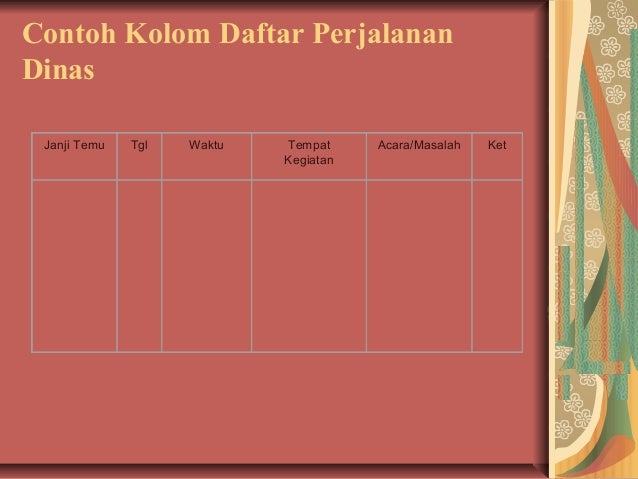 Contoh daftar perjalanan bisnis. Contoh format daftar perjalanan bisnis. Contoh jadwal perjalanan dinas pimpinan ke luar kota pemimpin perusahaan memiliki berbagai tugas dan tanggung jawab dalam menjalankan tugas rutin posisinya. Daftar perjalanan dibuat rangkap 4 empat untuk diberikan kepada pimpinan teman sejawat dan sekretaris. Daftar perjalanan bisnis itinerary yaitu sebuah rencana kegiatan yang akan dilakukan selama perjalanan bisnis yang merupakan kombinasi antara daftar perjalanan dan janji temu atau pertemuanadministrasi kantor atau sekretaris harus membuat lembaran daftar perjalanan dalam rangkap empat lembar pertama asli diserahka kepada pimpinan lembar kedua untuk wakil pimpinan lembar ketiga. Maksudnya prinsip dari asuransi syariah adalah saling menanggung risiko dan saling membantu yang berlandaskan al quran dan hadist. Tujuannya untuk mengetahui bahwa pimpinan sedang melakukan perjalanan bisnis atau dinas.