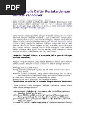 Pastinya di setiap buku terdapat daftar pustaka yang biasanya berada di bagian belakang buku tersebut. Setelah sebelumnya membahas daftar pustaka bergaya harvard kali ini akan dibahas tentang format penulisan daftar pustaka bergaya vancouver. Contoh daftar pustaka vancouver. Langkah langkah dalam cara menulis daftar pustaka dengan metode vancouver adapun langkah langkah yang dapat ditempuh dalam cara menulis daftar pustaka dengan metode vancouver adalah sebagai berikut. Ismid1 hadidjaja2 dan margono3 menyatakan bahwa prevalensi askariasis di indonesia cukup tinggi. Awalnya nama vancouver diambil karena sekelompok editor kedokteran berkupul di vancouver british columbia canada pada tahun 1979 untuk mebicarakan tentang petunjuk umum format manuskrip yang akan diterbitkan pada jurnal tersebut.