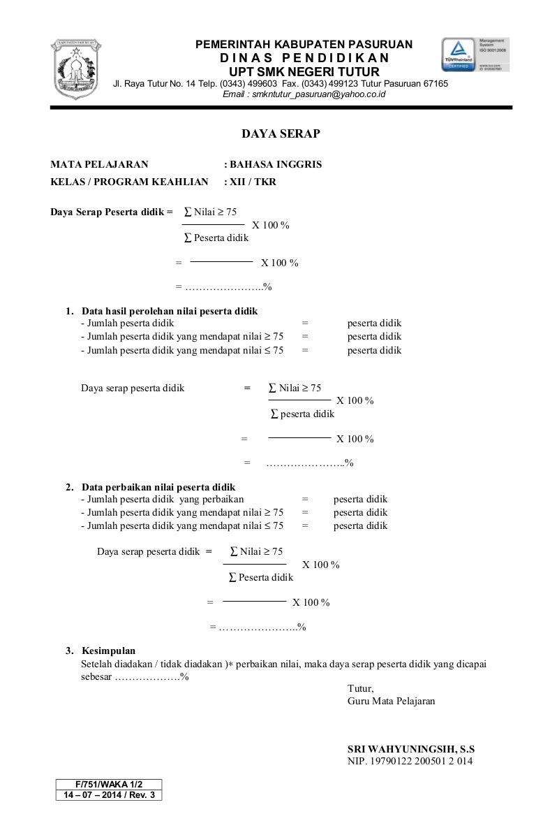 Contoh format analisis daya serap siswa sd smp sma ini merupakan format excel yang dibuat untuk memudahkan anda dalam menganalisi atau menghitung daya serap siswa atau disebut juga taraf serap. Untuk para guru yang belum mengetahui cara analisis daya serap siswa disini saya akan paparkan apa yang saya pahami mengenai hitung hitungan daya serap siswa. Praya2012 guru mata. K olom4 x100 k olom3 x10. Contoh format analisis daya serap siswa terbaru. Download format analisis hasil ulangan harian excel.